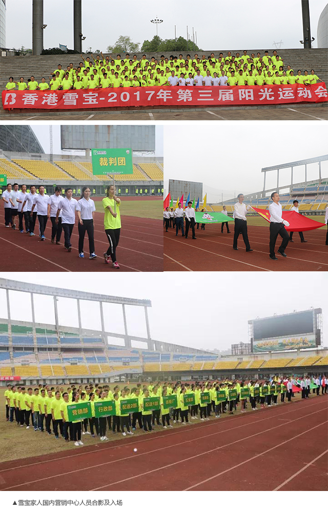 豐富職工體育生活,共建雪寶企業(yè)文化。在振奮人心的運(yùn)動(dòng)會(huì)入場(chǎng)樂中,雪寶品牌各部門團(tuán)隊(duì),身著統(tǒng)一的服裝,踏著鏗鏘有力的步伐有序的進(jìn)入會(huì)場(chǎng),在飄揚(yáng)的五星紅旗和香港雪寶陽光運(yùn)動(dòng)會(huì)會(huì)旗下,一字排開的隊(duì)伍方陣,盡顯風(fēng)采,每個(gè)人都精神抖擻,意氣風(fēng)發(fā)。