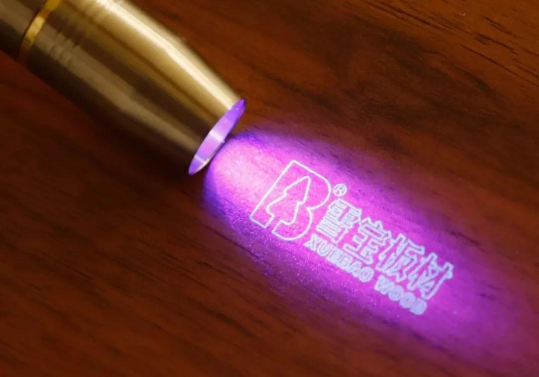 所有的雪寶板材上,都采用了這一防偽技術(shù)。識別的方法也很簡單:普通的紫光燈照射到我們雪寶板材的板面,即可顯示雪寶板材LOGO字樣,示例如下: