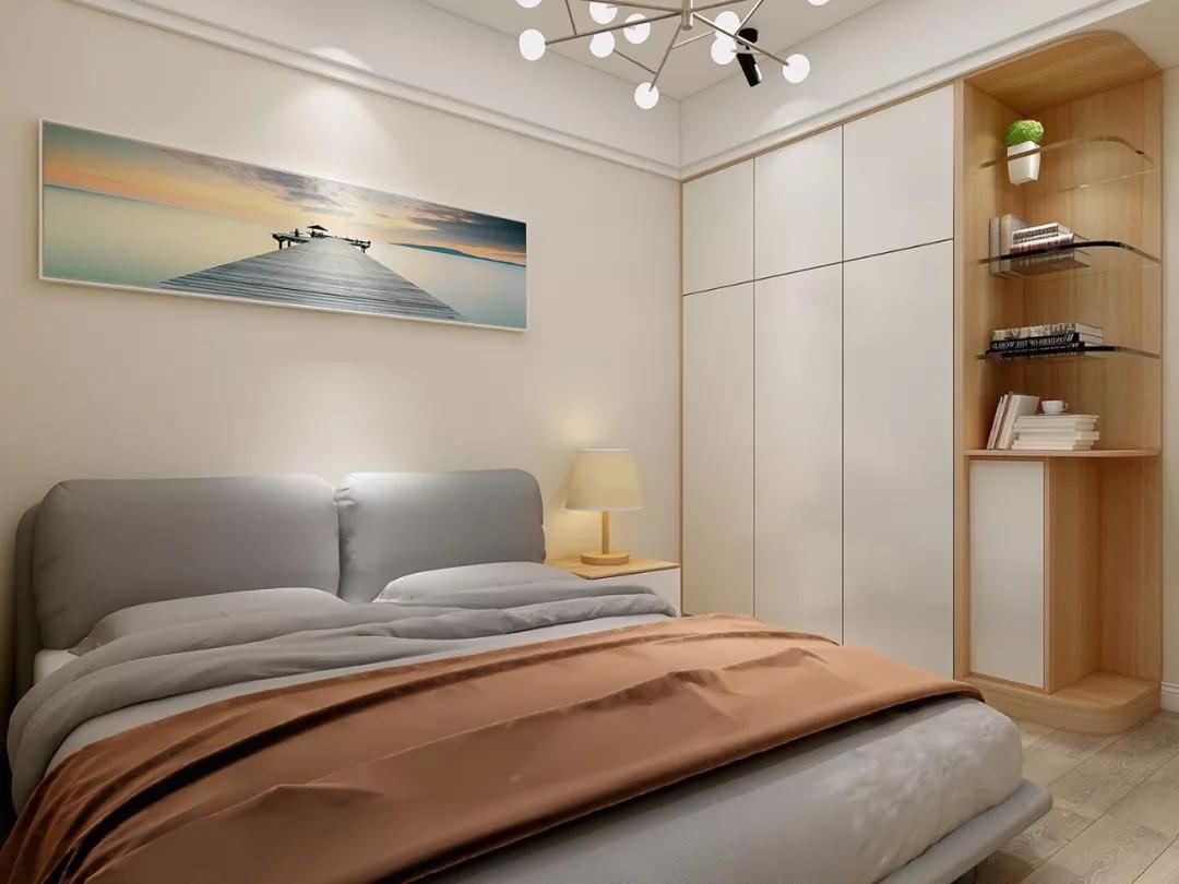除開飄窗,次臥空間面積略顯擁擠局促。通過睡眠、學(xué)習(xí)、儲物、活動四個基本功能區(qū)合理設(shè)計布局,既滿足日常儲物收納又不影響老人起居作息,在軟裝搭配上選擇深色系家紡,樸實沉穩(wěn),淡泊明志,寧靜致遠(yuǎn)。