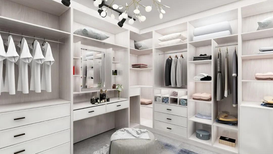 但是“先天條件不足”的衣帽間,也可以通過巧妙的空間布局來安排:正方形衣帽間多采用U型布局。狹長的空間可以選擇一字型布局,為中間的行走與換衣空間留出足夠的距離。L型衣帽間具有強大的儲物功能與實用性,比較適用于寬長形的空間。