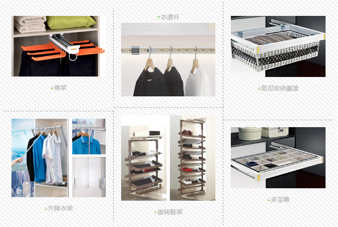 懸掛區(qū)設計,掛桿、掛褲架、衣通桿、升降衣架等,讓整個衣帽間功能和實用性大大提升。疊放區(qū)設計,抽屜、襯板、拉籃等,也能做到衣帽間收放整齊、熠熠生輝。同樣,旋轉鞋架、多寶箱等功能五金可以最大程度地節(jié)約空間。