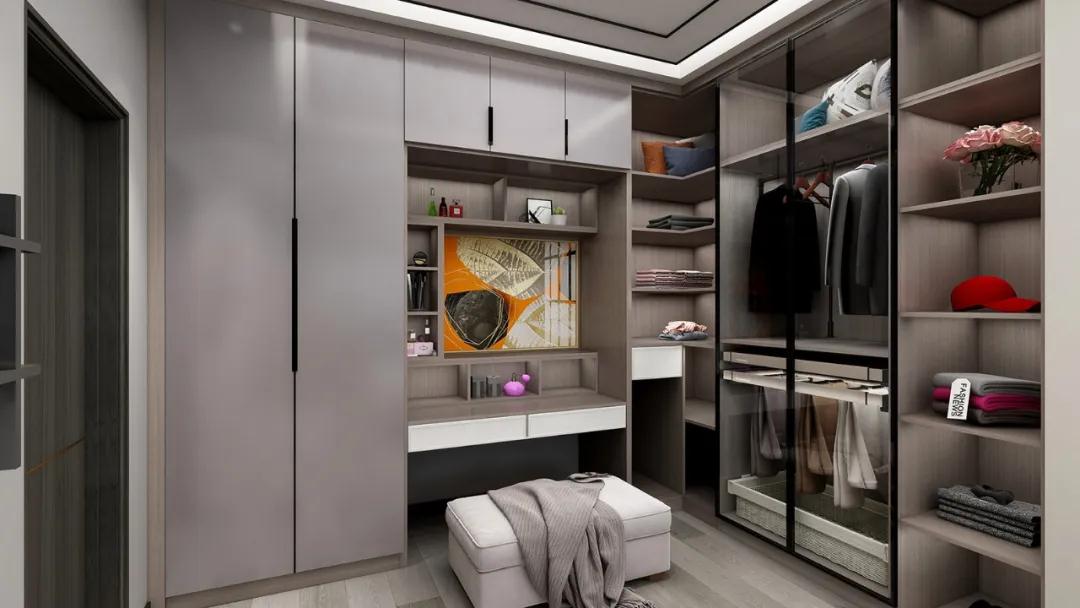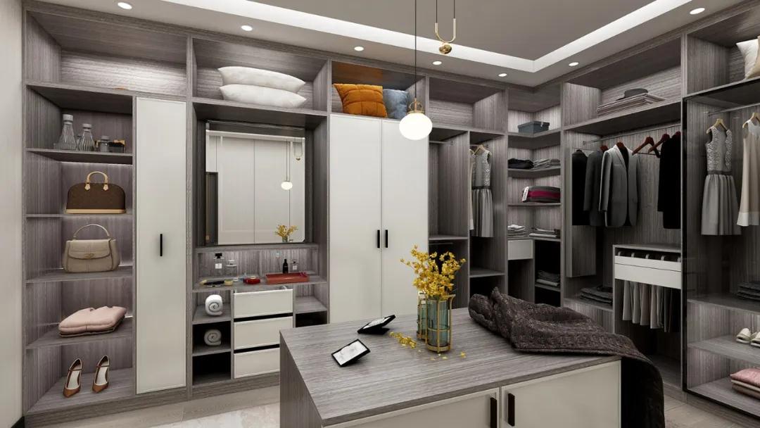 展示區(qū):展示區(qū)屬于衣柜的畫龍點(diǎn)金之處,可展示主人穿衣和生活品味。展示區(qū)可以是開放式的,也能是玻璃透明式的,開放式區(qū)域可以儲(chǔ)放收藏品或鑰匙錢包等,便于伸手取物。