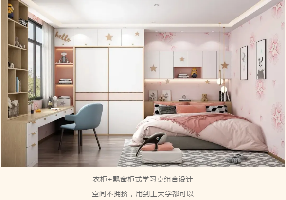 女孩房一般以暖色為主,可選擇粉色系作為主色,以淡雅或明亮的輔色,增加空間層次感和活潑度。