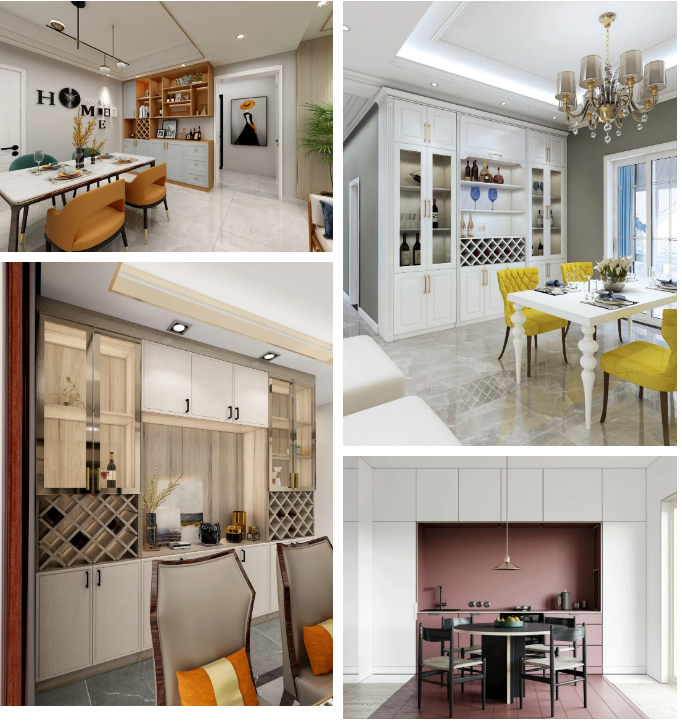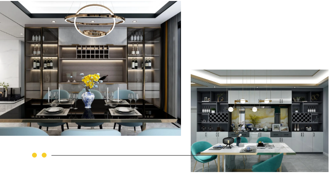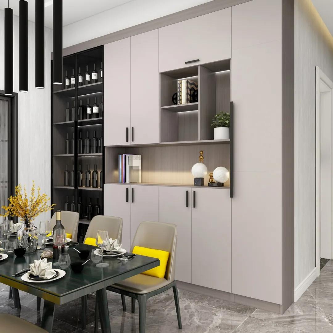 隨著現(xiàn)代生活理念的變化,輕奢元素進入更多年輕一代的生活,能更好的襯托出餐廳的格調(diào)。定制餐邊柜將墻面最大程度地利用,一柜到頂,合理劃分區(qū)域,做到餐具收納+展示柜+酒柜的多功能結(jié)合,是最佳的呈現(xiàn)。