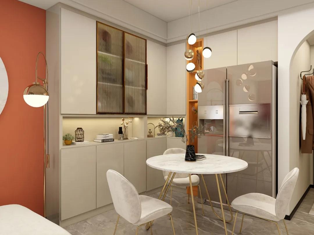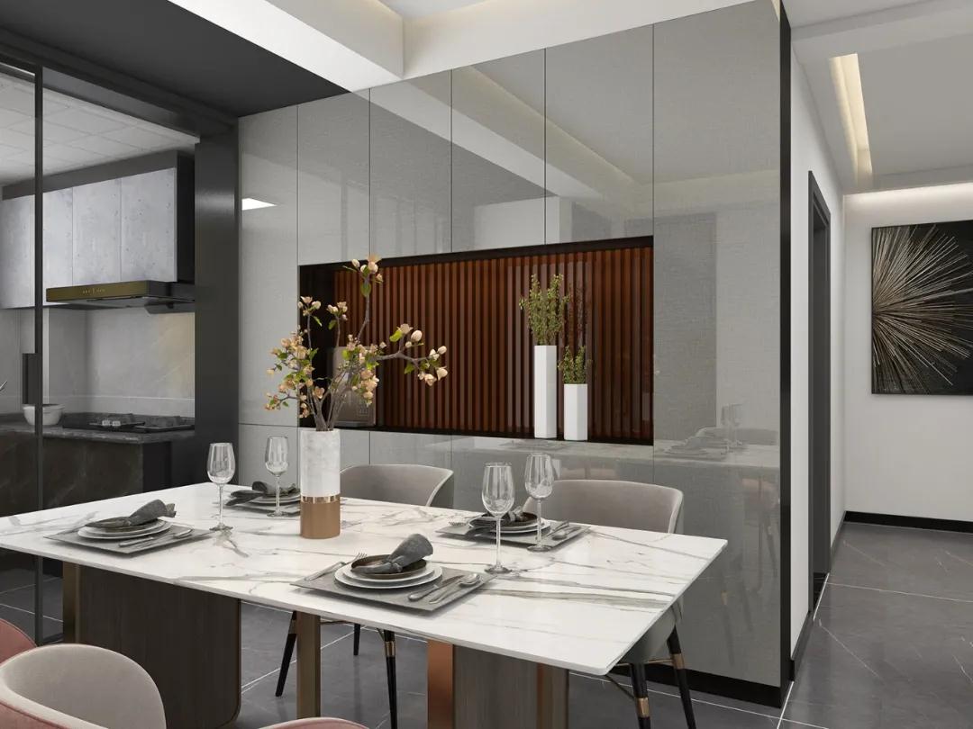 玻璃材質(zhì)展示出夢幻、晶瑩的效果,配合柔和的輔助燈光,更添氛圍感,輕奢氣質(zhì)呼之欲出。結(jié)合主人的喜好,擺放上收藏品、紅酒、綠植、畫作,讓用餐區(qū)域增添情調(diào),倍添姿色。