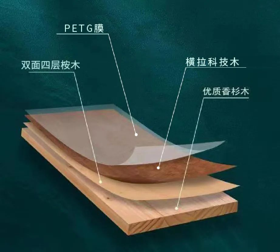 板芯精選規(guī)格統(tǒng)一的一級(jí)實(shí)木香杉方料齒接而成,首先貼第一層桉木養(yǎng)生一周并雙面精度砂光,再貼合第二層桉木再養(yǎng)生一周后,再一次進(jìn)行雙面等厚精度砂光處理,保證正誤差范圍20絲以內(nèi),然后做雙面橫拉科技木皮,確保板材平衡穩(wěn)定無變形,后貼楊木大皮保證板材表面平整光滑,最后貼雙面同色三聚氰胺紙后做PETG貼合。