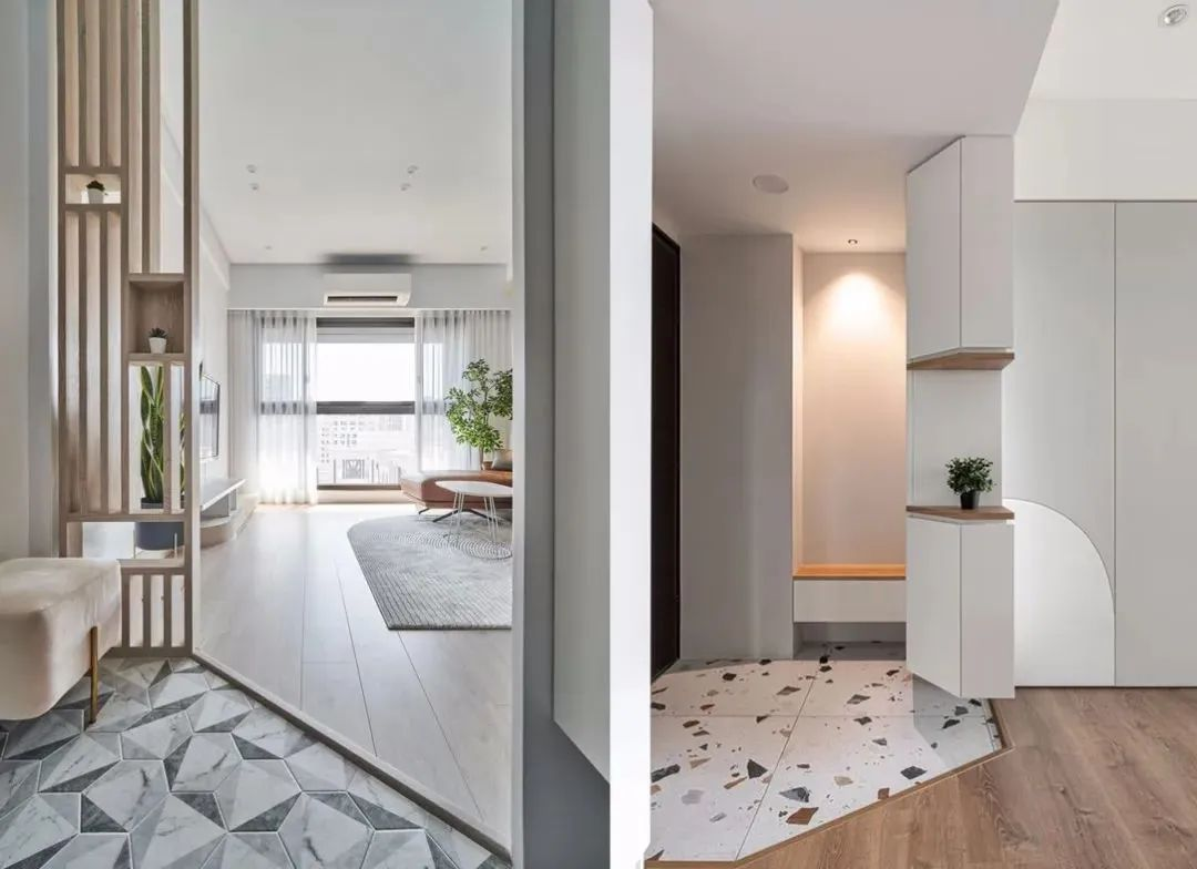 如果玄關(guān)客廳通鋪瓷磚那就比較好處理,如果客廳想鋪木地板的話,玄關(guān)地面可以選用瓷磚來(lái)進(jìn)行一個(gè)空間分隔,這樣不僅有高顏值,還能方便清潔劃分區(qū)域。