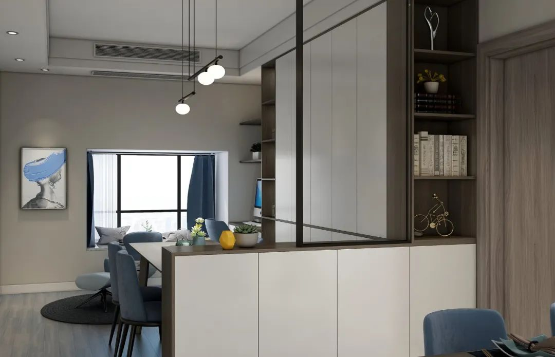 書柜與餐邊柜結(jié)合小戶型想要擁有獨立的書房太困難,這種情況下可靈活利用書柜+餐邊柜造出一間多功能"書房"。餐廳的使用率低,日常就餐之外,作為辦公學(xué)習(xí)之處使用,再合適不過