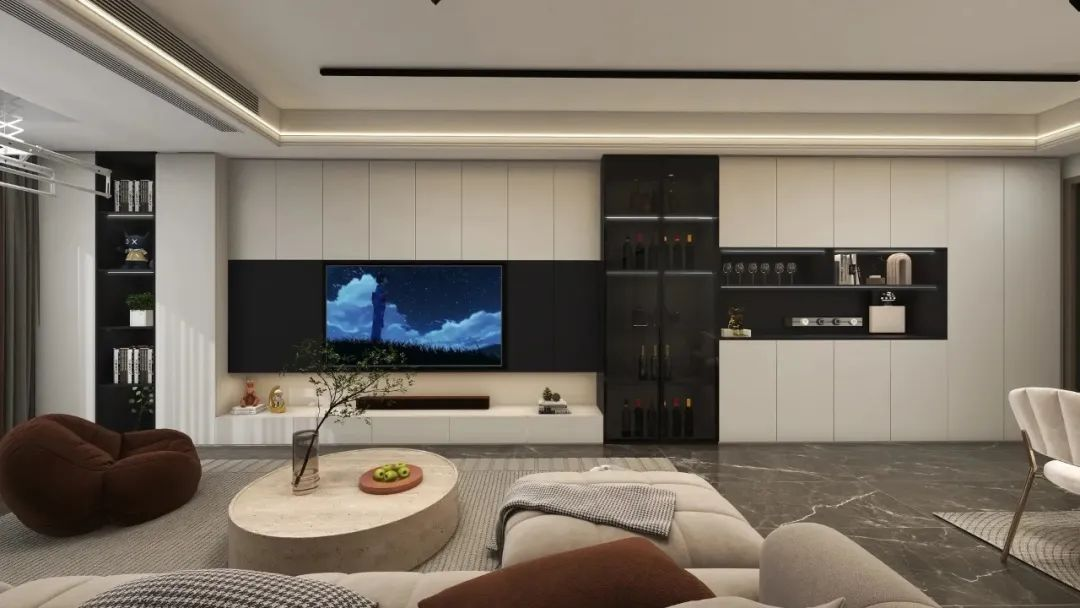 電視柜與餐邊柜結(jié)合電視柜+餐邊柜適用于客廳餐廳有相連墻體的情況。餐邊柜+電視柜一體化設(shè)計,柜體貫穿兩個區(qū)域,給客廳和餐廳都帶來充足的收納儲物空間。
