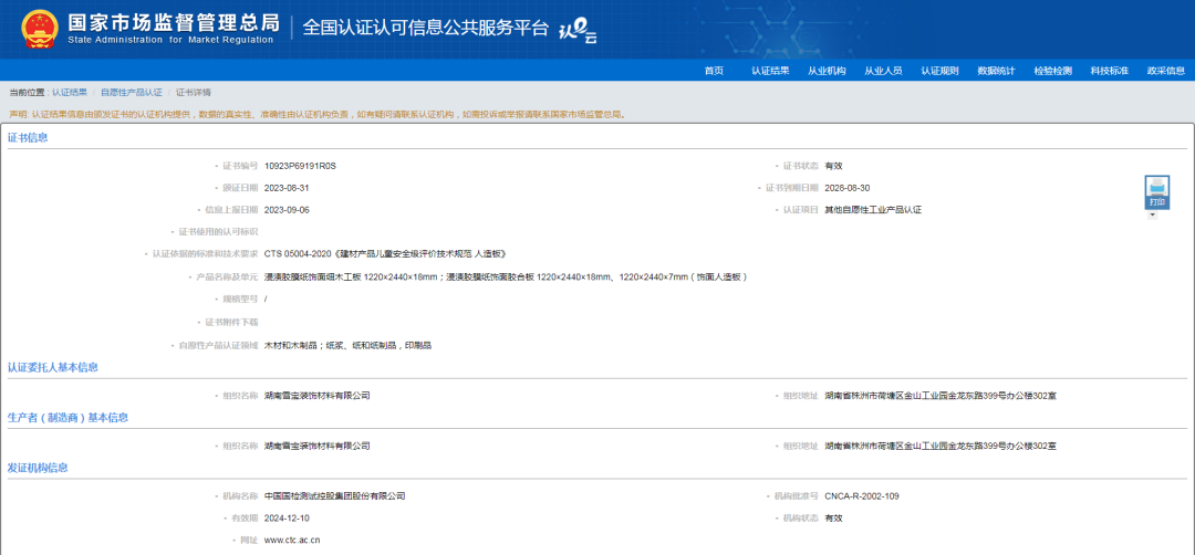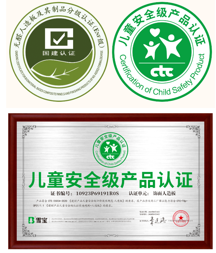 兒童安全級(jí)產(chǎn)品認(rèn)證,以更嚴(yán)苛的環(huán)保標(biāo)準(zhǔn)、更嚴(yán)謹(jǐn)?shù)恼J(rèn)證規(guī)則,旨為保障兒童活動(dòng)場(chǎng)所質(zhì)量及環(huán)境安全健康,也為踐行國(guó)家質(zhì)量強(qiáng)國(guó)戰(zhàn)略、保證兒童健康生活貢獻(xiàn)力量。本次獲得由中國(guó)國(guó)檢測(cè)試控股集團(tuán)股份有限公司(CTC)出具的兒童安全級(jí)產(chǎn)品認(rèn)證證書顯示:產(chǎn)品符合 CTS 05004-2020《建材產(chǎn)品兒童安全級(jí)評(píng)價(jià)技術(shù)規(guī)范人造板》的要求,進(jìn)一步有力證明了雪寶板材飾面人造板材系列產(chǎn)品的健康和環(huán)保性,同時(shí),雪寶板材產(chǎn)品環(huán)保性、安全性得到國(guó)家官方權(quán)威機(jī)構(gòu)的認(rèn)證,也是對(duì)我們致力拔高行業(yè)的產(chǎn)品環(huán)保水平新高度的認(rèn)可和肯定!