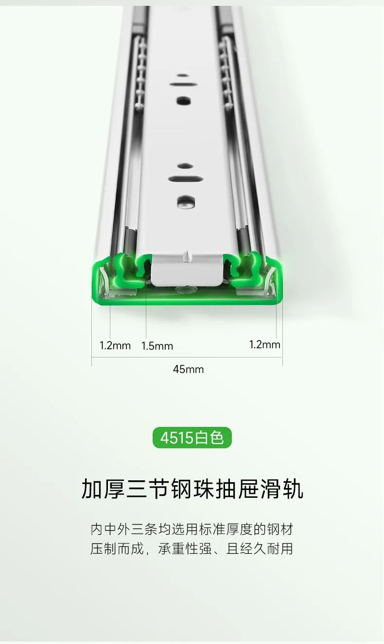 4515緩沖款:緩沖更平穩(wěn)4515反彈款:輕松按彈開啟無論是緩沖款還是反彈款,都具備下述優(yōu)勢:1、上海寶鋼原材料,高光封閉電鍍,抗銹能力極強;2、加厚三節(jié)鋼珠抽屜滑軌,標(biāo)準(zhǔn)厚度,經(jīng)久耐用;3、進口高精圓鋼珠,平穩(wěn)、順暢,開合更靜音;4、三節(jié)軌全拉出,抽屜一覽無余,空間最大化;5、承重30kg,平穩(wěn)堅固;6、防撞膠墊,降噪消音;