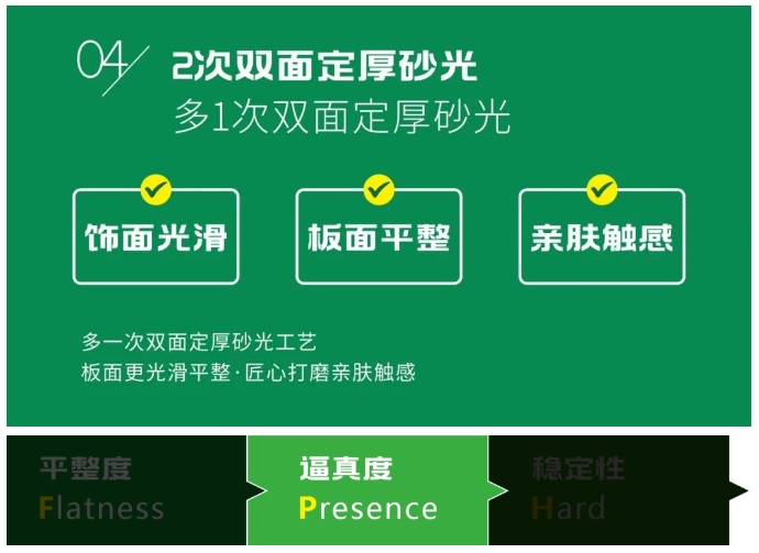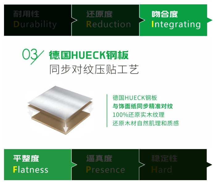從飾面紙張的耐用性(Durabilityt)、3D印刷技術(shù)實(shí)木紋理的還原度(Reduction)、鋼板與飾面紙同步精準(zhǔn)對紋壓貼的吻合度(Integrating)、2次雙面定厚砂光板面的平整度(Flatness)、4+1色印刷技術(shù)的飾面效果逼真度(Presence)、進(jìn)口艾克洛油墨工藝締造10年色澤如新的穩(wěn)定性(Hard)6個維度創(chuàng)造,100%還原實(shí)木紋理。