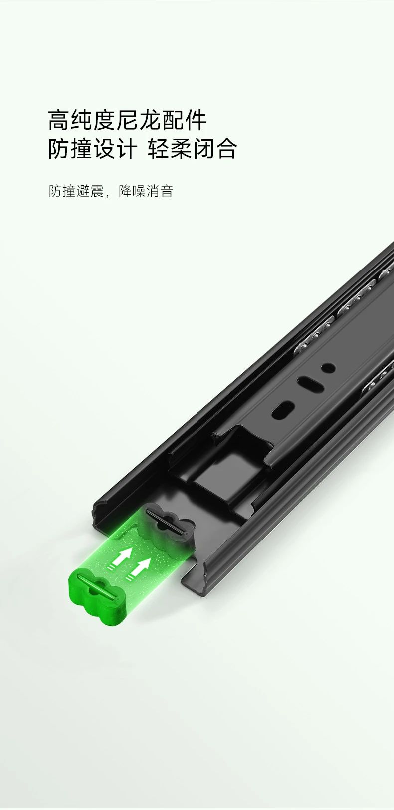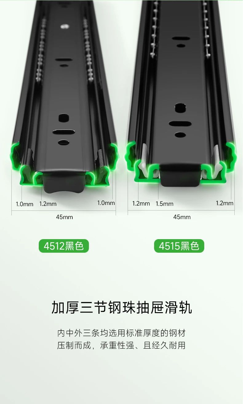 抽屜在家具中的使用很關(guān)鍵,對于抽屜而言,滑軌就是抽屜的“心臟”。于家居收納中有著無與倫比的作用,讓空間在無序中建立有序。而抽屜的使用體驗,絕大程度上取決于滑軌。開合是否能順滑、能抽拉到什么程度、承重如何、會不會翻傾等問題,都跟滑軌有關(guān)系,因此選擇一個品質(zhì)好的滑軌很重要。雪寶4512黑色鋼珠三節(jié)滑軌,精工設(shè)計,內(nèi)置鋼珠,穩(wěn)定性強(qiáng),全程順滑到底。三節(jié)全拉出設(shè)計,抽屜空間一覽無余,物品收納整齊有序,取物更輕松。表面電鍍工藝,抗腐蝕,耐磨損,久用如新,無需頻繁更換?燎笃焚|(zhì)細(xì)節(jié),讓每一次推拉都是一種享受!